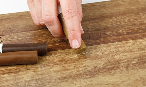 Remove any slight excess or dirt. Rub multiple shades of Quick Filler (light/medium/dark) into the scratch, alternating perpendicular to the scratch to match the colour of the surface.