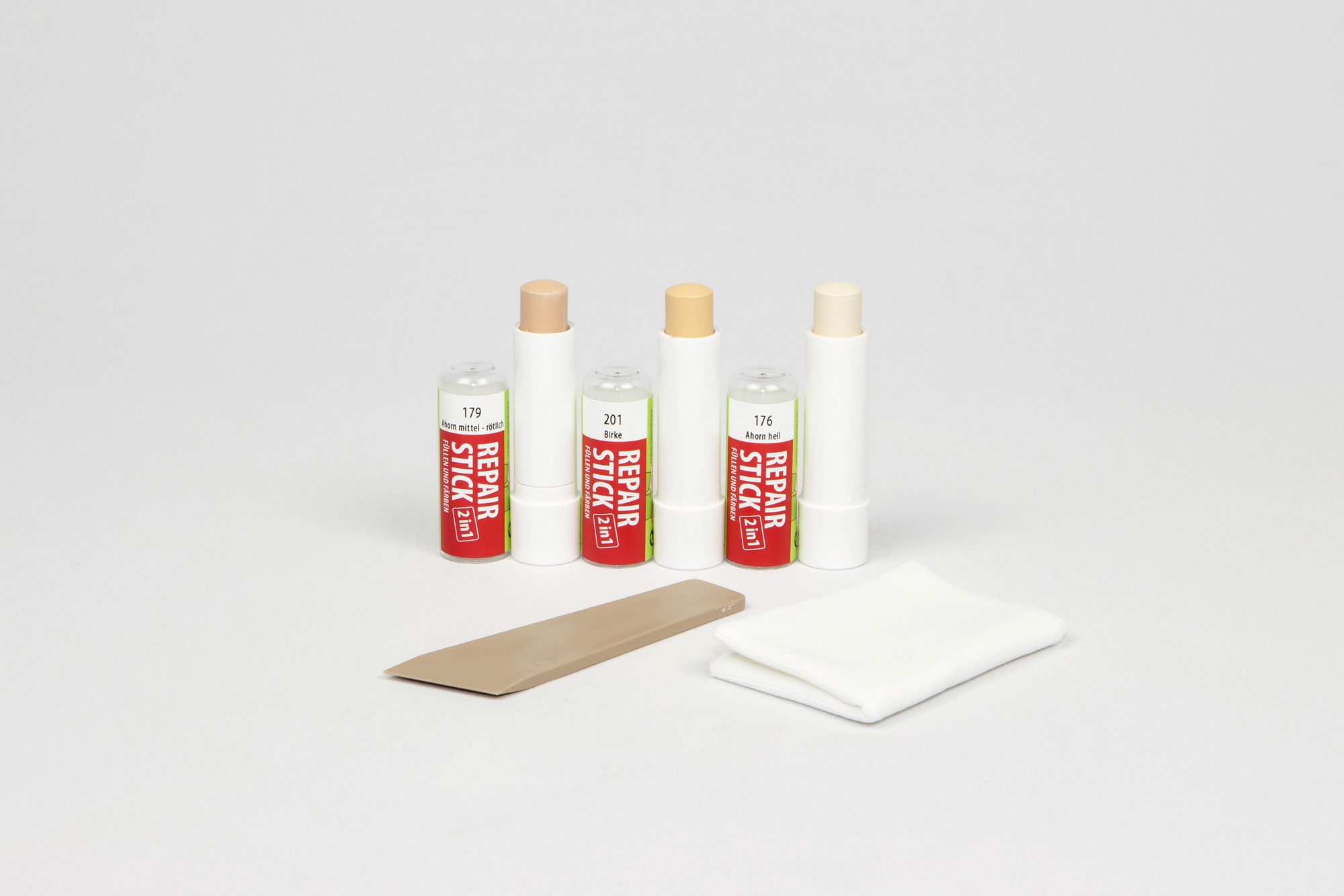 1) Cleaning: Remove loose, protruding parts with a spatula. The surface must be clean, dry and free of grease. 2) Filling: Select a suitable color for the surface and rub the wax in across the scratch. In the case of damage in the edge area, simply rub over the edge. 3) Leveling: Using the front edge of the spatula, rub in the applied wax with light pressure and circular movements, and remove the excess. Wipe off any excess in the edge area with the cloth. 4) Colour adjustment: Adjust the structure of the surface with matching shades. If necessary, imitate the grain with fine strokes. Rub in the applied wax again with the spatula. 5) Degrease: Stretch the cotton cloth around the tip of the spatula and use it to remove the surrounding wax. Use a wax-free part of the cloth to lightly wipe and degrease the filled area and the immediate surroundings. TIP: To protect against dust and dirt, we recommend sealing the damage with the AQUA Brsuh Pen Clear Lacquer.