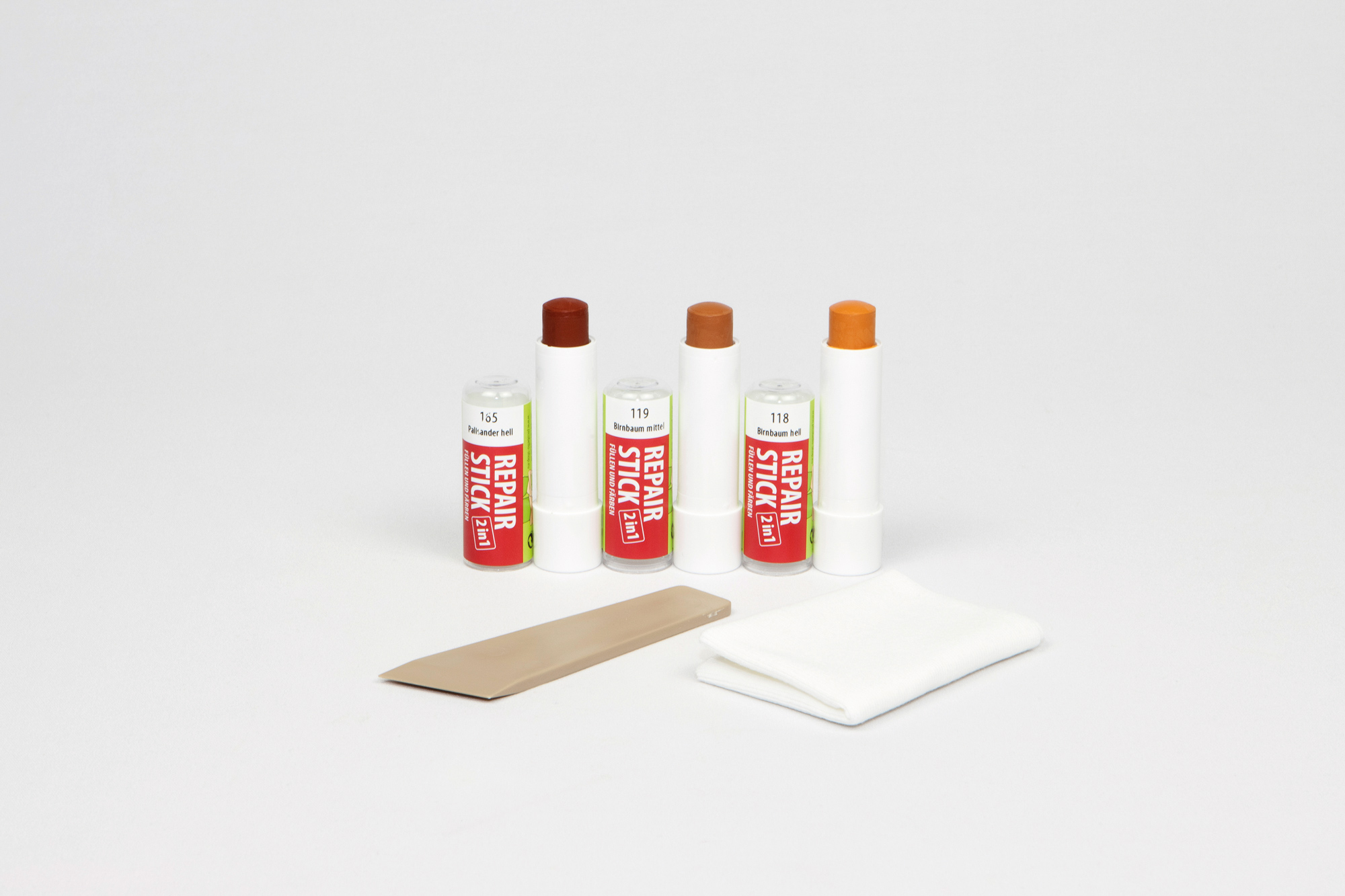 1) Cleaning: Remove loose, protruding parts with a spatula. The surface must be clean, dry and free of grease. 2) Filling: Select a suitable color for the surface and rub the wax in across the scratch. In the case of damage in the edge area, simply rub over the edge. 3) Leveling: Using the front edge of the spatula, rub in the applied wax with light pressure and circular movements, and remove the excess. Wipe off any excess in the edge area with the cloth. 4) Colour adjustment: Adjust the structure of the surface with matching shades. If necessary, imitate the grain with fine strokes. Rub in the applied wax again with the spatula. 5) Degrease: Stretch the cotton cloth around the tip of the spatula and use it to remove the surrounding wax. Use a wax-free part of the cloth to lightly wipe and degrease the filled area and the immediate surroundings. TIP: To protect against dust and dirt, we recommend sealing the damage with the AQUA Brsuh Pen Clear Lacquer.