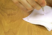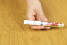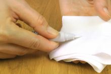 Hold pen with tip pointing downwards over the cotton cloth and again squeeze area marked “P/PRESS”. Lacquer flows into the brush tip. Slightly dab brush tip on the cloth to avoid a sealing that is too wet.